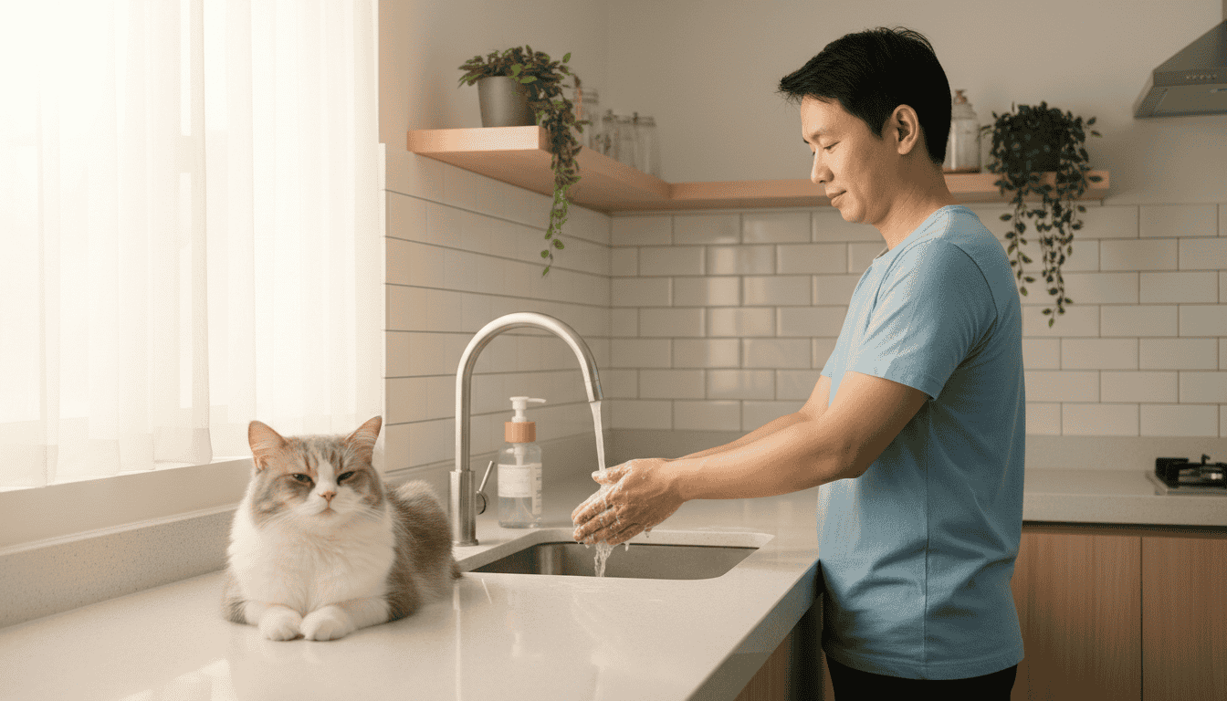 | Basuh tangan selepas pegang kucing | Guna sabun dan air. Ini langkah paling asas tapi paling berkesan. |