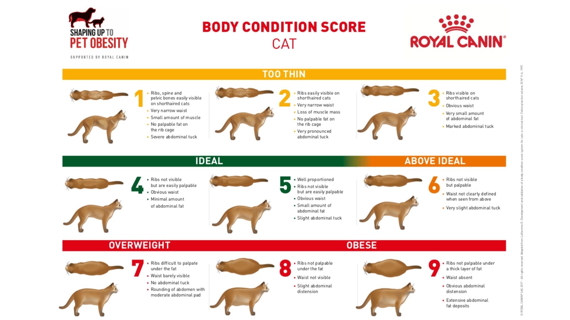 The ideal BCS score is 4 to 5. A score of 6 or above indicates that your cat is overweight or severely obese. The Royal Canin has an in-depth article on how you can calculate your cat’s BCS.