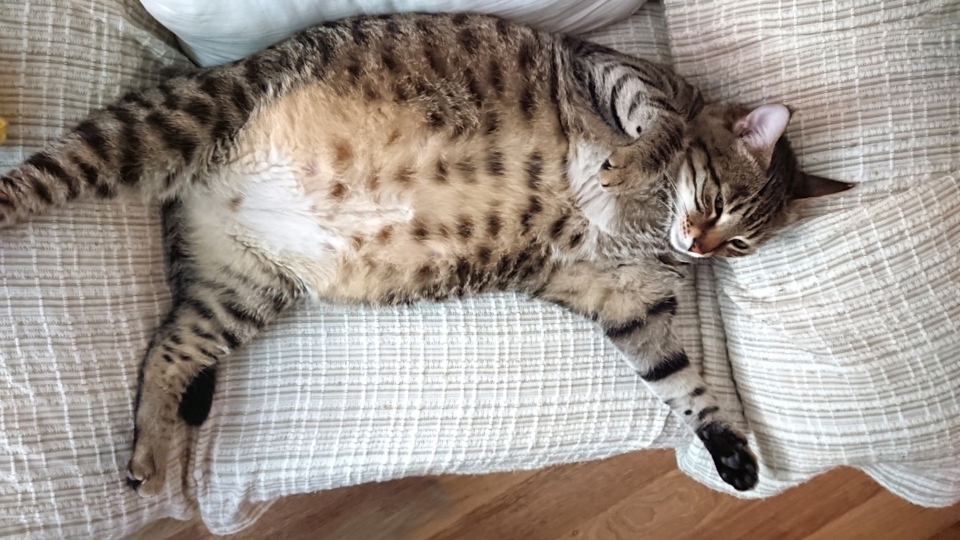 - You can see a prominent pouch or bulge at the abdomen of your cat, indicating excess fat storage.